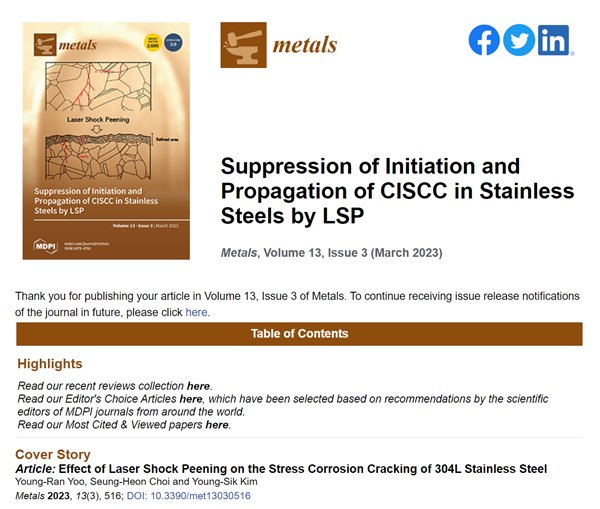 첨단재료공학과 청정에너지소재기술연구센터 유영란 박사와 최승헌 박사과정(지도교수: 김영식)이 최근 투고한 논문이 Metals 저널 20233월호 표지논문으로 선정되었다. 표지논문은 “Effect of Laser Shock Peening on the Stress Corrosion Cracking of 304L Stainless Steel”로서 방사성폐기물 처분 용기의 내식성을 증가시키는 레이저 충격 피닝의 효과와 그 메커니즘을 규명함으로써 표지논문으로 선정되었다.